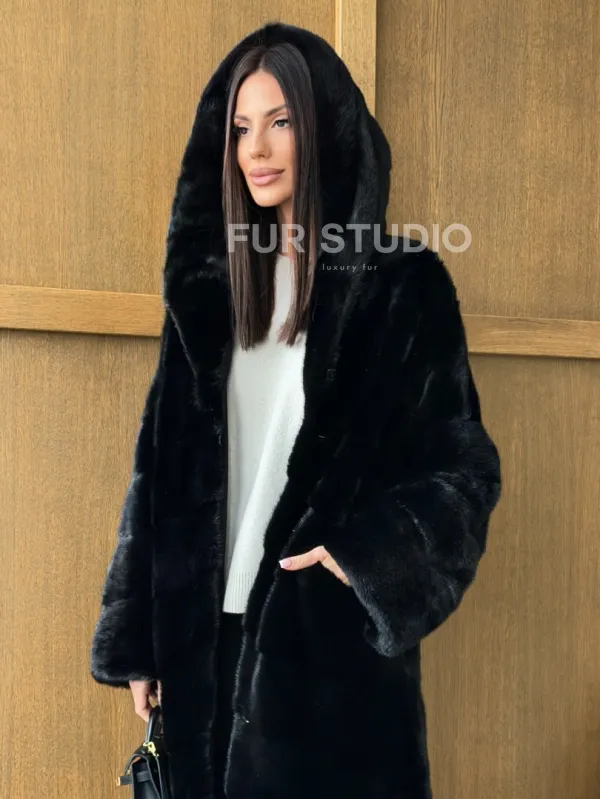 Черная норковая шуба с капюшоном 102765