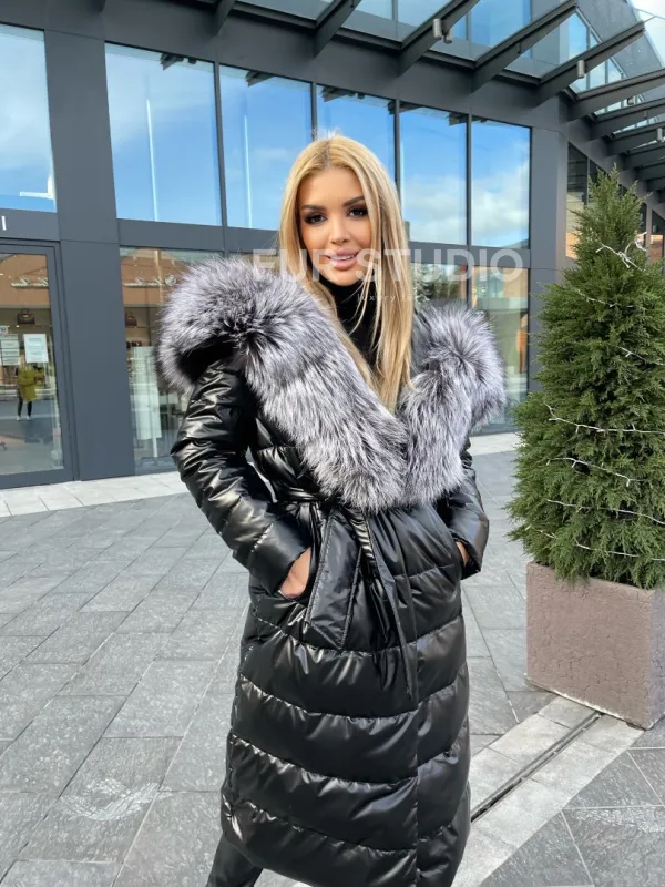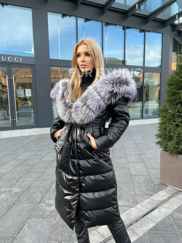 Чёрное пуховое пальто с меховым капюшоном 100223