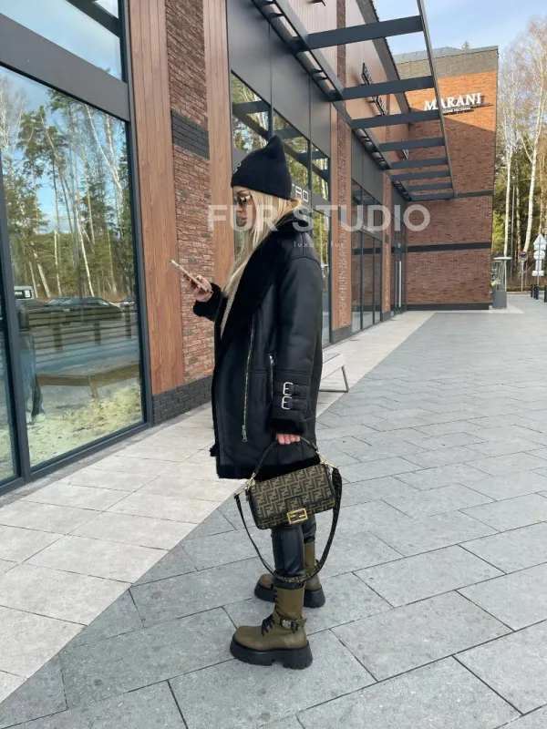 Дубленка авиатор удлиненная – тренд этого года. Модель прекрасно подходит всем девушкам вне зависимости от их возраста и типа фигуры. Удлиненное изделие зрительно увеличивает рост владелицы и скрывает недостатки силуэта. Шикарный воротник позаботится о комфорте шеи. Теплая подкладка не даст замерзнуть в холодную зиму. Ремешки на рукавах делают образ экстравагантным.