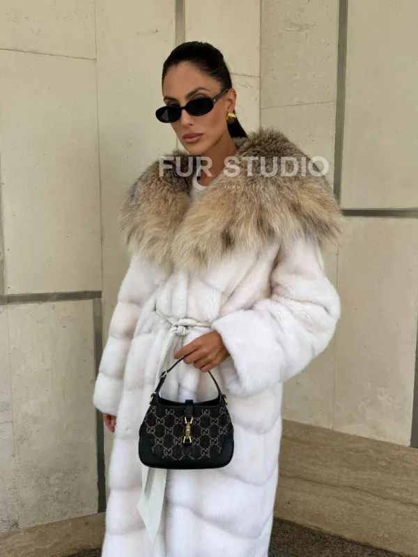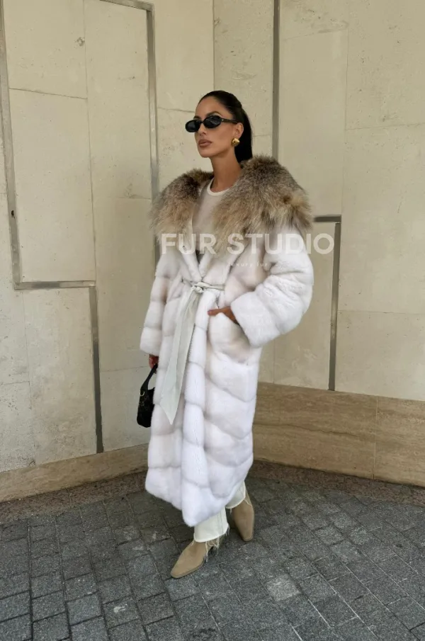 Мех данной шубы аукционная норка, цвет белый. Предлагается в размерах от 42 до 54. Длина модели 115-120 см, что выгодно подчеркивает фигуру девушек. Эта модель идеально подойдет для девушек и женщин, предпочитающих роскошные натуральные меха.