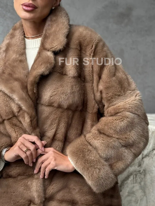 Мех данной шубы аукционная норка, цвет бежевый. Предлагается в размерах от 42 до 54. Длина модели 65-70 см , что выгодно подчеркивает фигуру девушек. Эта модель идеально подойдет для девушек и женщин, предпочитающих роскошные натуральные меха.