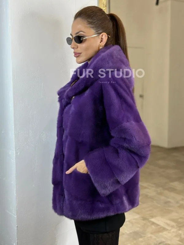 Мех данной шубы аукционная норка, цвет фиолетовый. Предлагается в размерах от 40 до 54. Длина модели 60-65 см, что выгодно подчеркивает фигуру девушек. Эта модель идеально подойдет для девушек и женщин, предпочитающих роскошные натуральные меха.