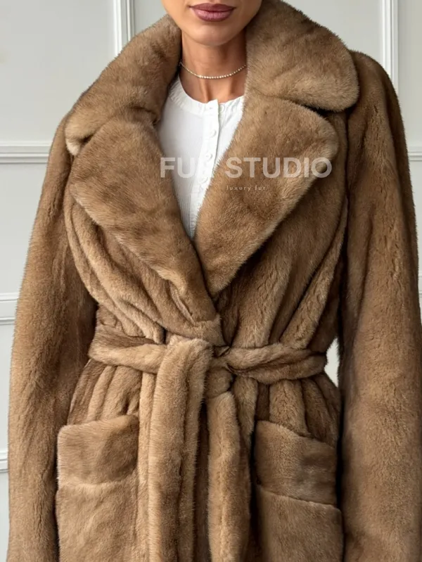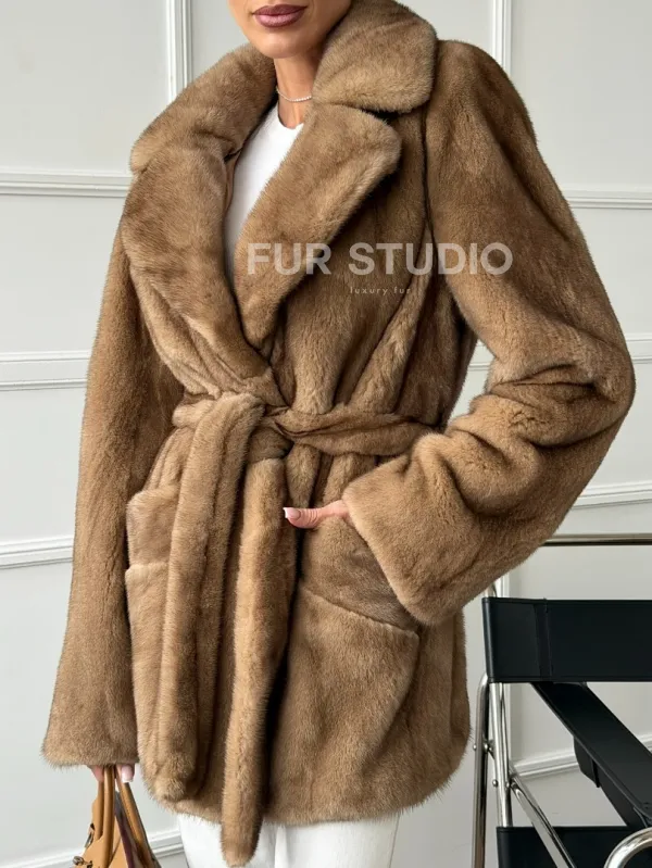 Полушубок норковый пастель с меховым поясом 102664