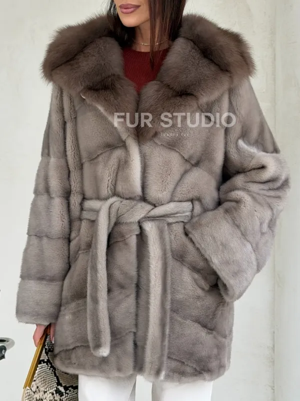 Серый норковый полушубок - капюшон куница 102553