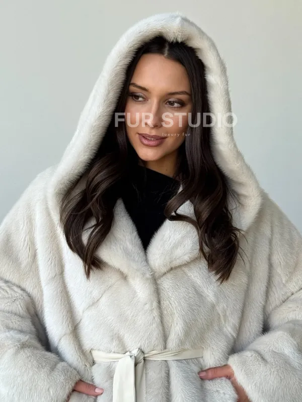 Мех данной шубы аукционная норка , цвет белый. Предлагается в размерах от 42 до 54. Длина модели 75-80 см, что выгодно подчеркивает фигуру девушек. Эта модель идеально подойдет для девушек и женщин, предпочитающих роскошные натуральные меха.