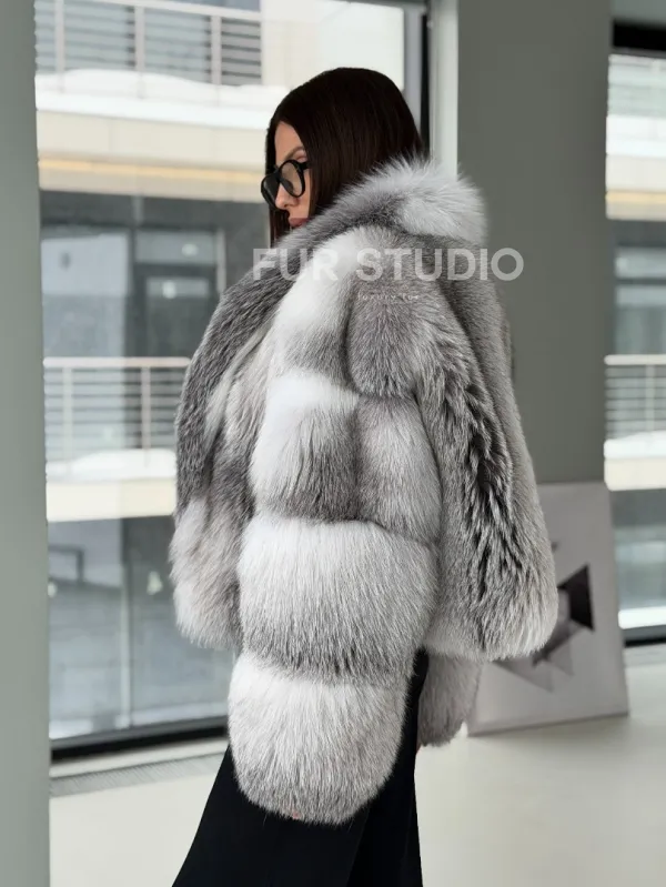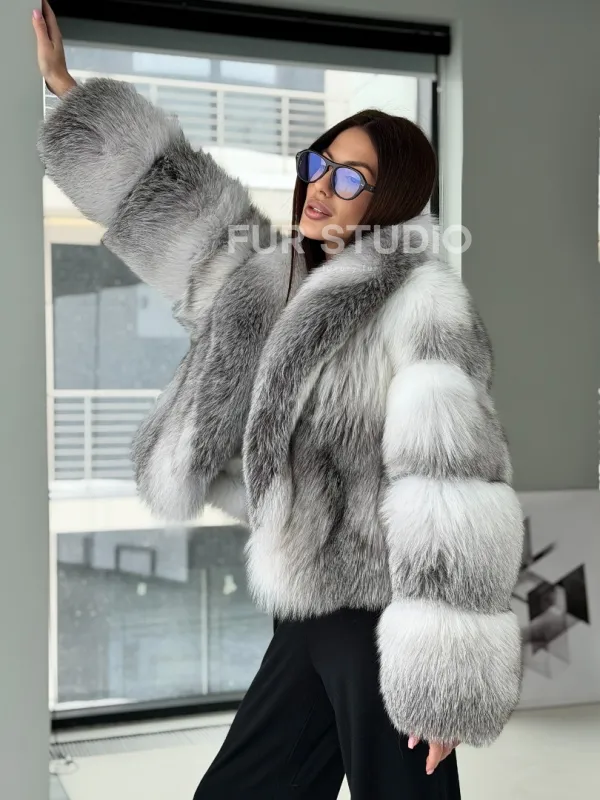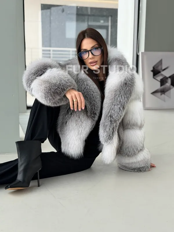 Мех данной шубы лиса, цвет белый. Предлагается в размерах от 42 до 50. Длина модели 55-60 см, что выгодно подчеркивает фигуру девушек. Эта модель идеально подойдет для девушек и женщин, предпочитающих роскошные натуральные меха.