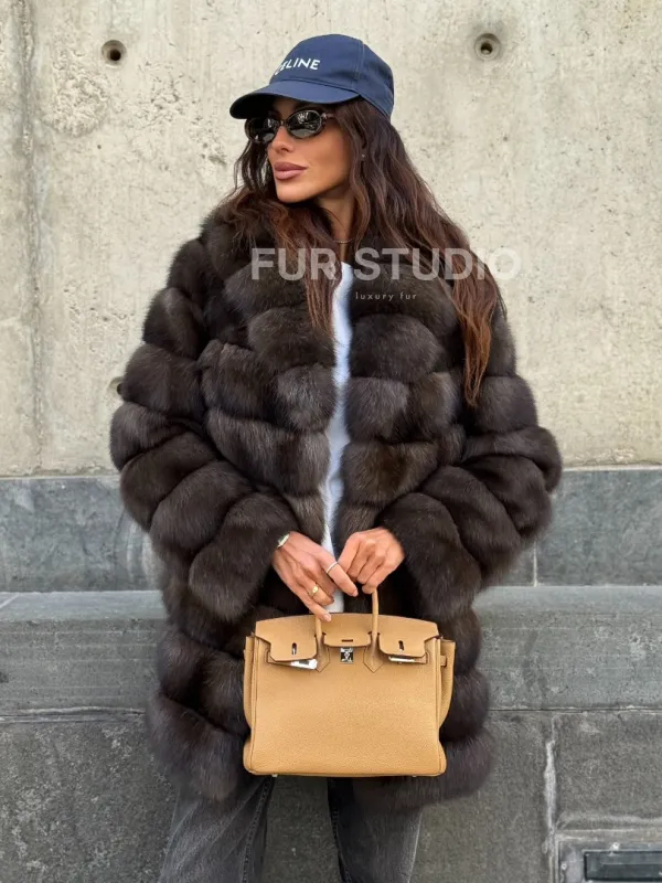Оптимальная длина удобна в носке, не сковывает движение. Воротник стойка позаботится о шее в непогоду и подчеркнет ее изящество. Широкие рукава выделят тонкие кисти. Прямой крой удлиняет силуэт и зрительно скрывает недостатки фигуры. Купить шубу из меха соболя станет отличным вложением для женщин, которые не привыкли себе в чем-то отказывать.