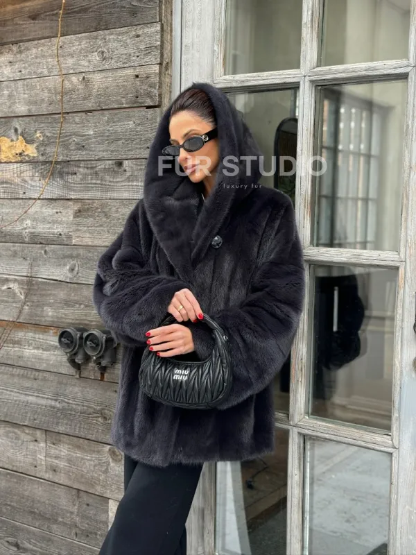Шуба норковая с капюшоном - цвет графит 100680