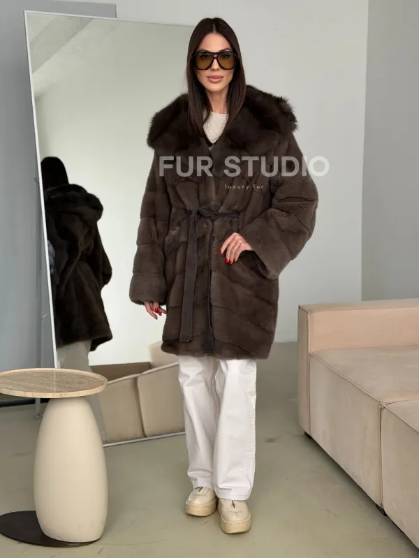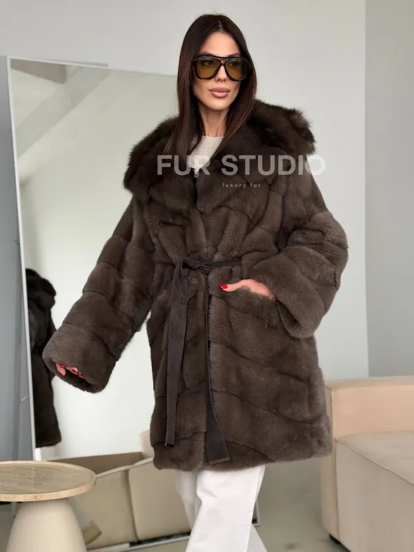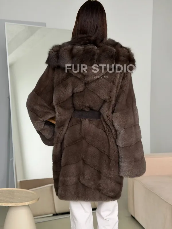 Шуба норковая с капюшоном из куницы 102786