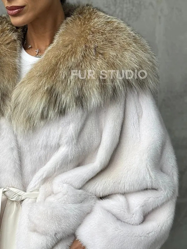 Мех данной шубы аукционная норка, цвет белый. Предлагается в размерах от 42 до 54 (oversize). Длина модели 70-75 см, что выгодно подчеркивает фигуру девушек. Эта модель идеально подойдет для девушек и женщин, предпочитающих роскошные натуральные меха.