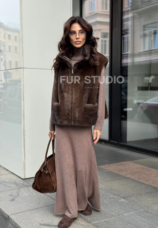 Мех данного жилета - аукционная норка, цвет коричневый. Идеальная длина модели 60-65 см лестно подчеркнет вашу фигуру. Эта модель станет неотъемлемой частью гардероба для женщин, предпочитающих непревзойденный стиль и роскошь натуральных материалов.